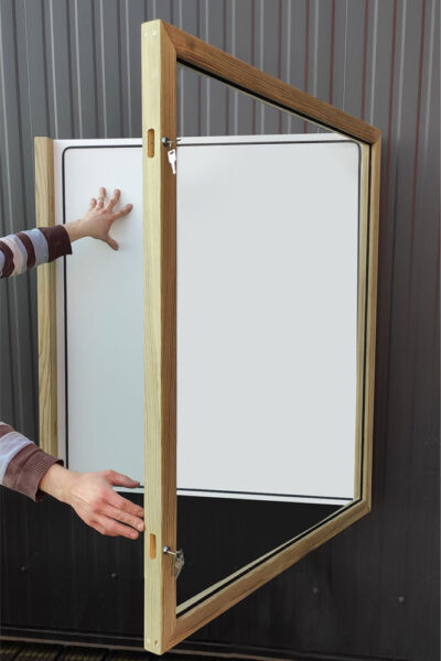 vitrine d'affichage en bois bandeau galbé est un support de communication visuel .