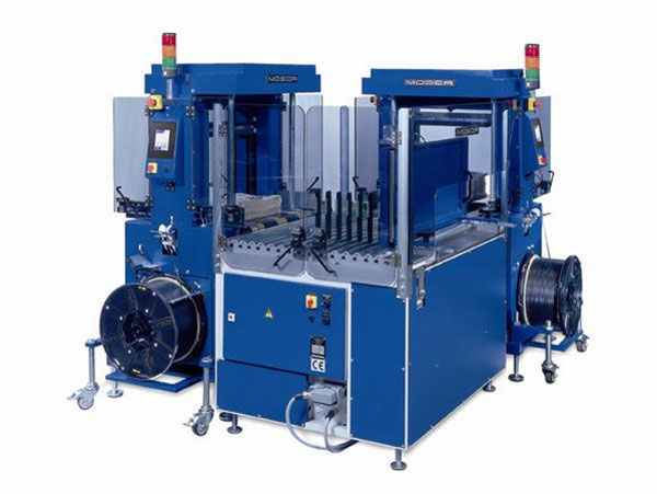 Ce tandem de cerclage de haute cadence jusqu'à 40 cerclages croisés par minute est constitué de 2 cercleuses mosca full automatique associé à un renvoi d'angle (système montée-baisse au moyen de rouleaux et bandes).