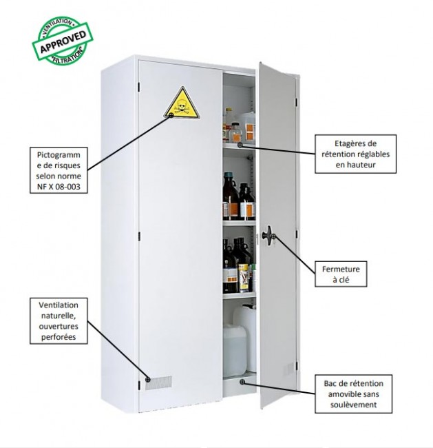 27/03/2026armoire pour produits chimiques en tole d"acier peinte époxy. Raccord pour ventilation sur le dessus et grille d"aération sur les portes.Verouillages des portes par tringlerie et serrure à cilindre. Tablettes réglables en hauteur par pas de 25 mm. 4 tablettes en partie basse. Charges maxi :30 kg. 1cuve de retention en PE à poser sur la tablette basse. dimensions: 1 m de largeur ; 0.5 m de profondeur ; 1.8 de hauteur ; nombre 1 unité