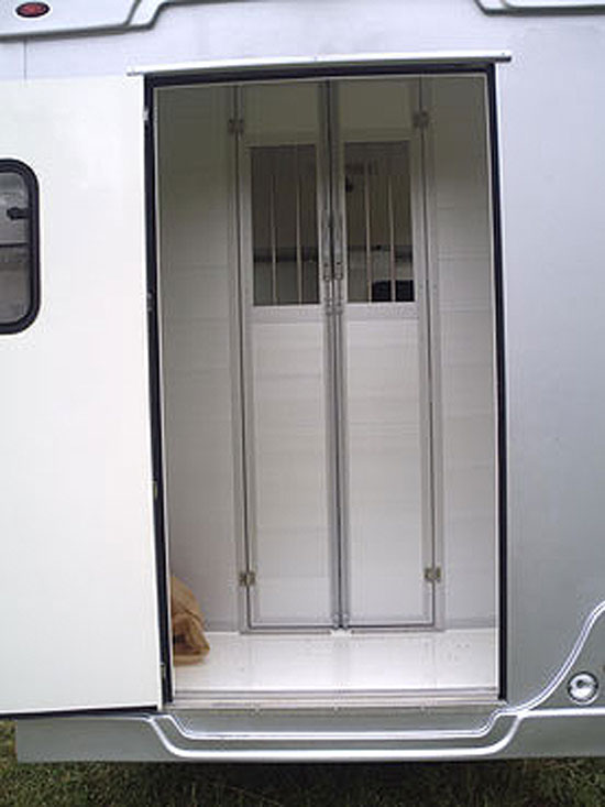 Accès pont arrière, 2 places chevaux en biais, 2 fenêtres de chaque côté (soit 4 fenêtres pour les chevaux)