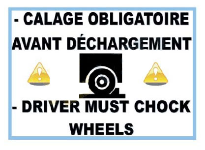 - Texte bilingue "Calage obligatoire avant déchargement"- "Driver must chock wheels".
