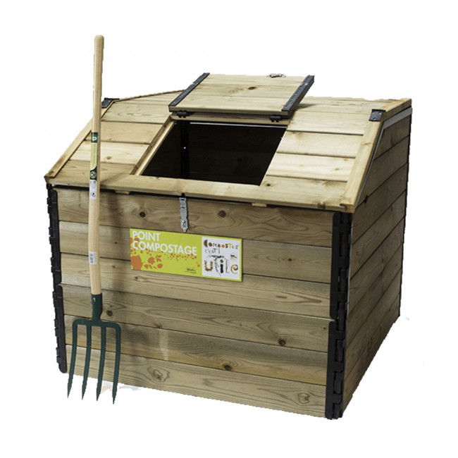 Le mélange et l’aération du compost sont facilités par un grand couvercle articulé en deux parties, sécurisé par deux portes cadenas.