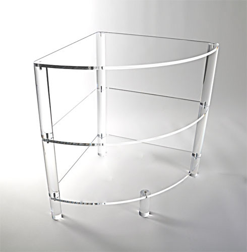Conçue comme une véritable console d'angle acrylique, elle offre trois niveaux de rangement optimisés pour vos objets décoratifs, livres ou accessoires.