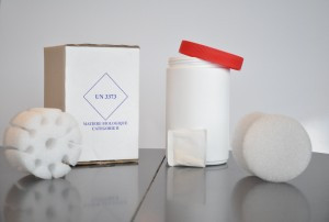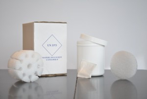- Emballage secondaire étanche sous forme de pot avec un couvercle à visser dans lequel est placé un garnissage en mousse qui a la fonction de portoir de tubes et de calage avec absorbant-rétenteur