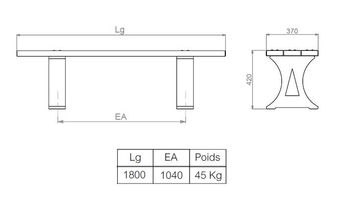 Avec une longueur de 1800 mm et un hauteur d'assise de 420 mm, ce modèle de banc public sans dossier est disponible en marron ou en gris.