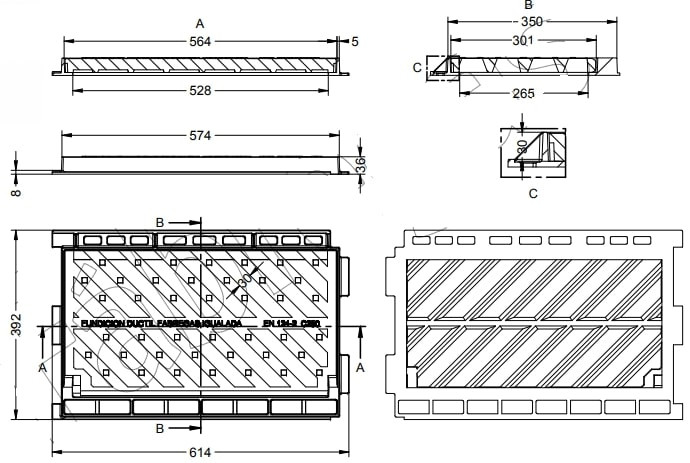 Grille et cadre inclinable en fonte dúctile pour une charge de 25 Tn C-250.