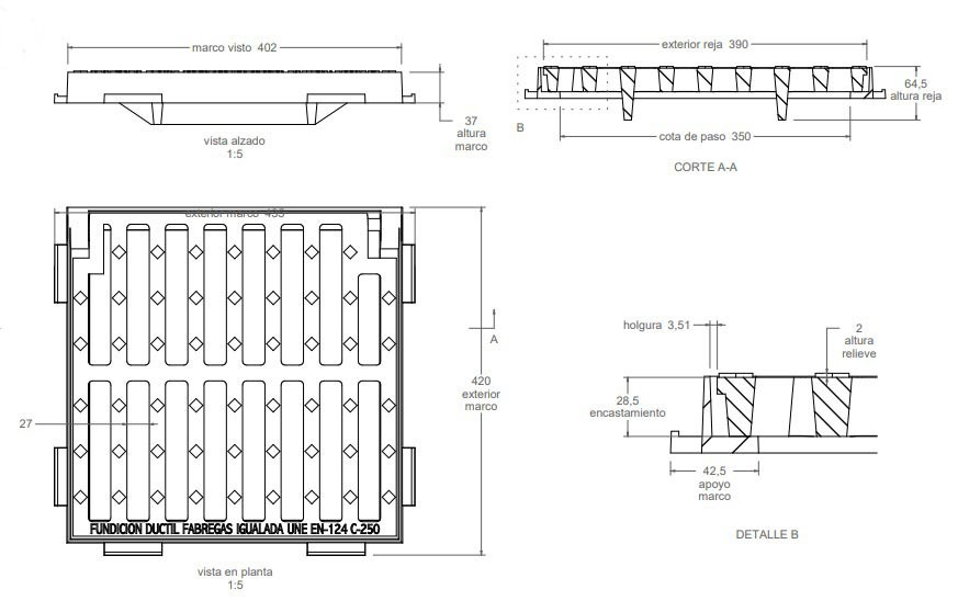 Conforme à la norme UNE EN-124, classe C-250 (charge jusqu’à 25 tonnes)