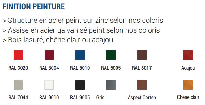 Le produit est disponible dans une large gamme de coloris RAL (dont 6005, 3004, 9005, etc.), ainsi qu’en finition aspect corten ou gris PROCITY®.