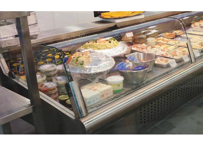 vitrine traiteur sur 3m env et un meuble pour la caisse enregistreuse.