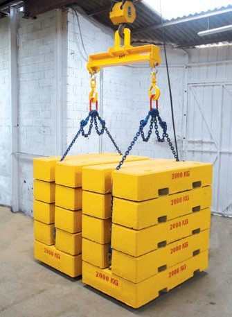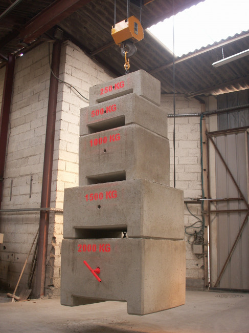 Pour étalonner nos équipements de levage, nous avons besoin d"un lest de 1000kg, d"un deuxième de 500kg et enfin deux de 250kg.