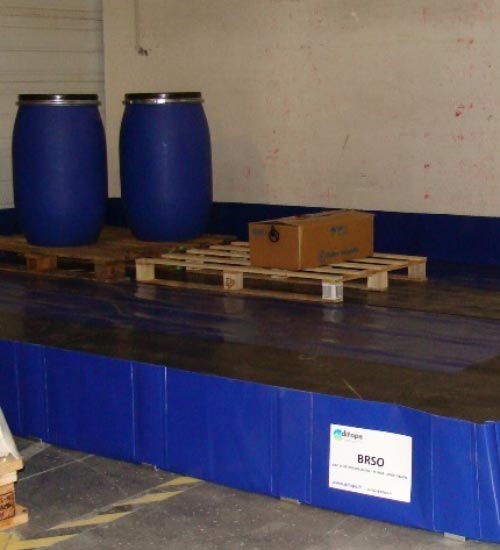 - Possibilité en option de le munir de bandes de roulement ou tapis en caoutchouc pour permettre de protéger le bac de rétention lors de stockage de véhicules roulants ou de matériels pouvant endommager le bac souple.