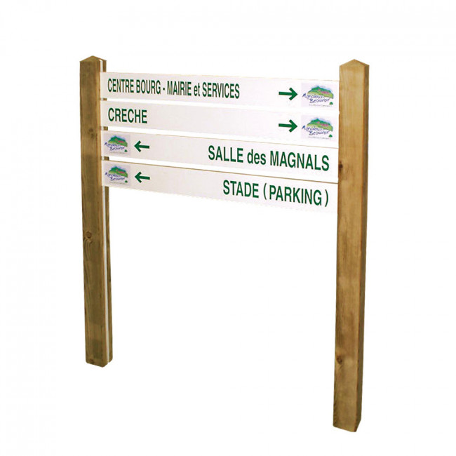 Ce panneau bi-mâts en bois à lattes en aluminium est parfait pour indiquer les différents lieux d'une agglomération ou d'un village.
