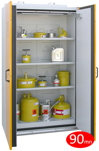 Armoire de sécurité coupe-feu 90 mn pour produits inflammables avec rétention et fermeture automatique en cas d'incendie.