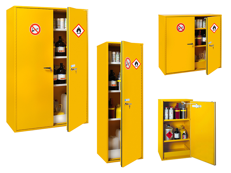 Armoire de sécurité pour produits inflammables double paroi isolée avec rétention et fermeture automatique.