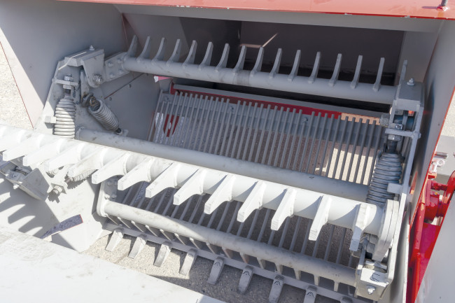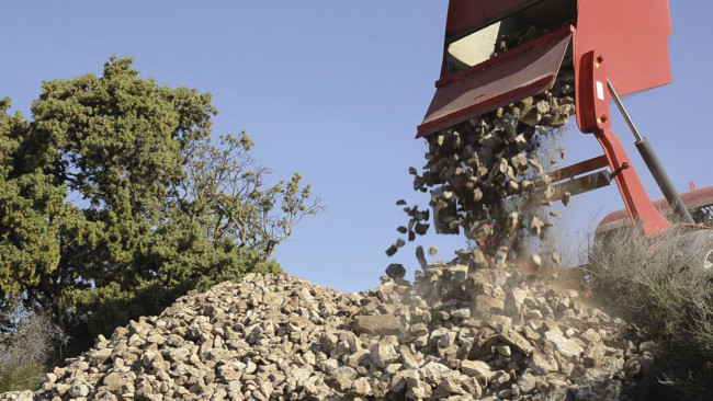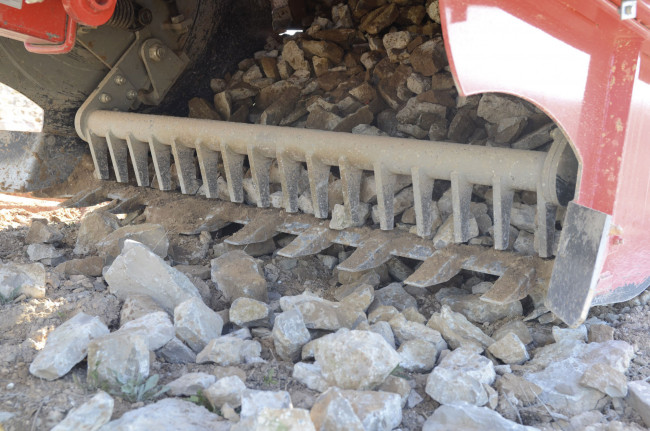• À mesure que le rotor reprend les pierres, il les dépose dans une trémie qui par la suite est vidée dans le chantier ou dans une remorque.