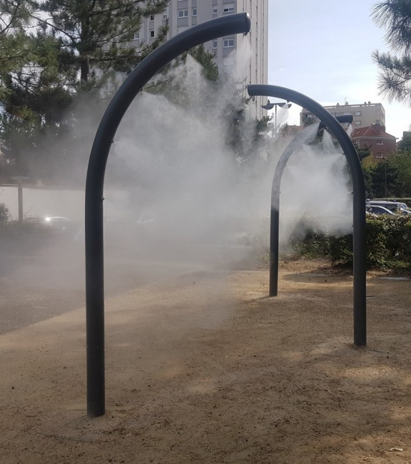 - 2 arches en inox(mat recourbé) équipée chacune de 7/8 buses pour créer un espace fraîcheur sur une placette publique.
