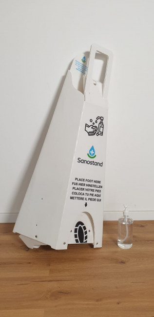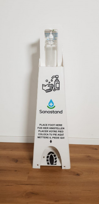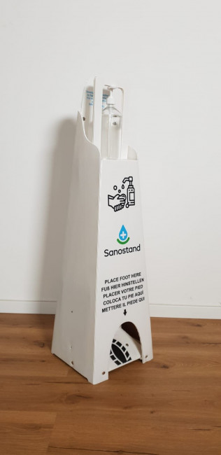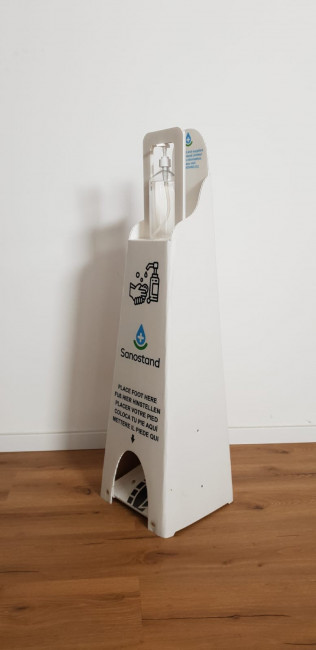 Ce distributeur de gel hydroalcoolique pliable est 100% recyclable et sans contact Il y a un espace prévu pour y poser son pied et ainsi appuyer pour faire couler le gel.