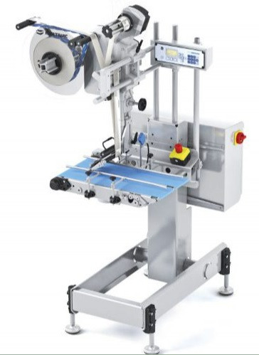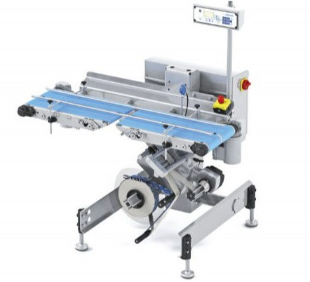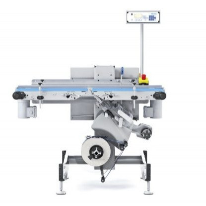 L'étiqueteuse à tapis de transport permet d'appliquer les étiquettes par :