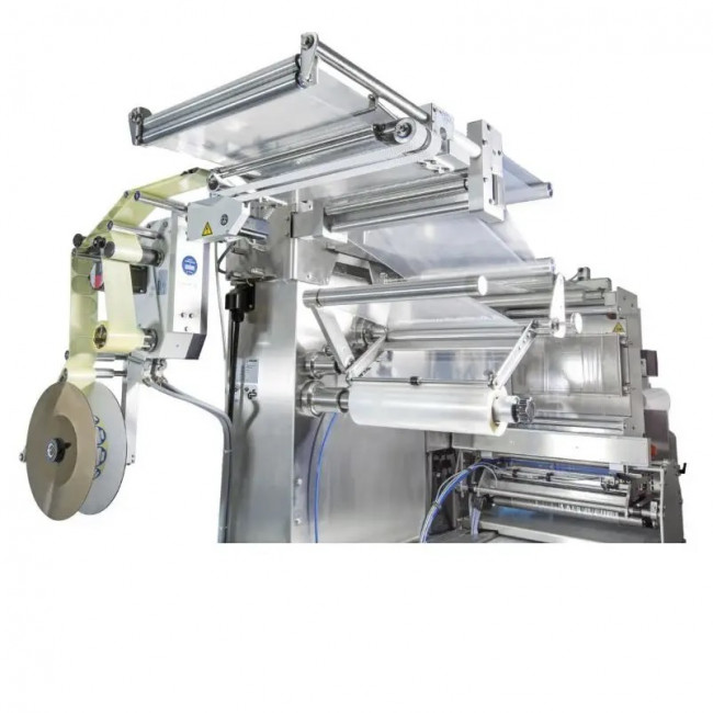 Cette étiqueteuse à voie transversale est conçue pour placer des étiquettes sur le film haut d'un emballage thermoformé.