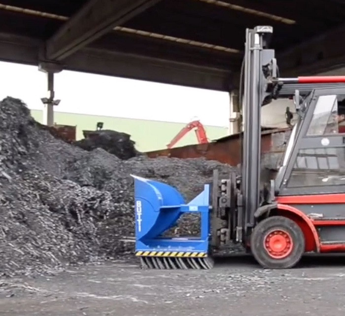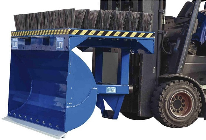 Cette brosse hydride avec godet pour chariot élévateur nettoie rapidement et efficacement de grandes surfaces intérieures ou extérieures.