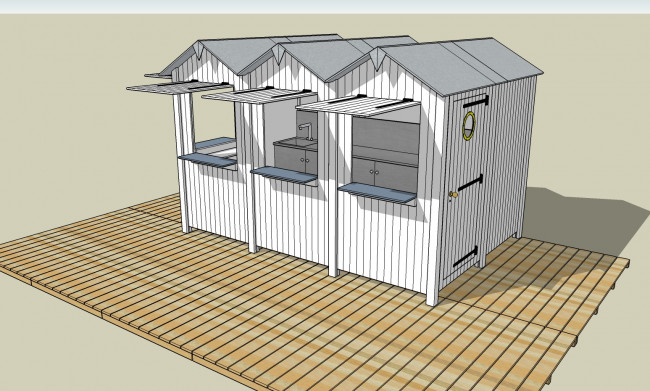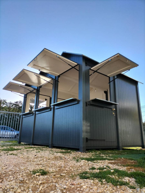 Modulable (en ajoutant des modules en longueur et profondeur de 1.50m2 à plus de 20m2). Démontable (pour les saisonniers et l'evenementiel). Personnalisable ( choix des teintes - de la surface de travail - du nombres de portes et de kiosques). Un espace de travail performant et ergonomique. Grande solidité. Fabrication 100% Française de haute qualité (fait main). Nombreuses options ( toiture zinc - étageres - cloisonnement - banc - sol souple). Poids 1500 kgs. Devis rapide sur simple demande. Livraison et installation dans toute l'Europe. Tarif de ce modele à partir de 10 100.00€ HT
