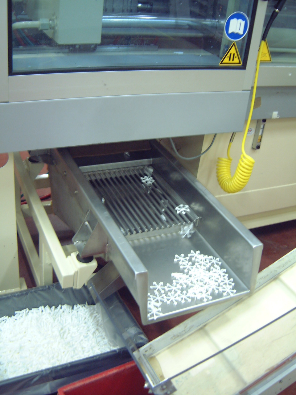 Installé sous la presse d’injection ou après le tapis de relevage, ce séparateur pièces/carottes permet une séparation efficace des carottes plastiques et des pièces moulées, en temps masqué, sans ralentir le cycle de production.