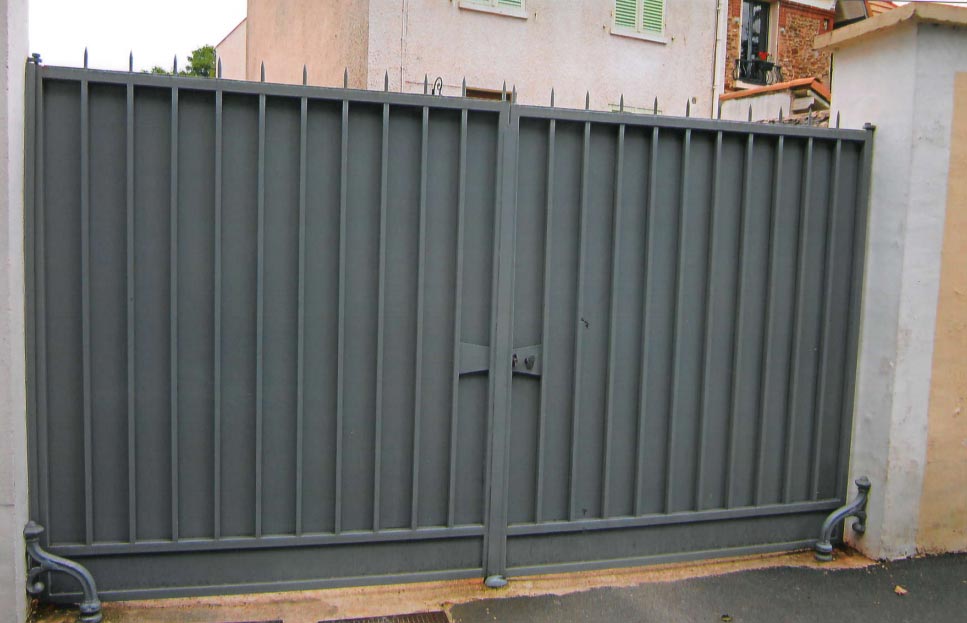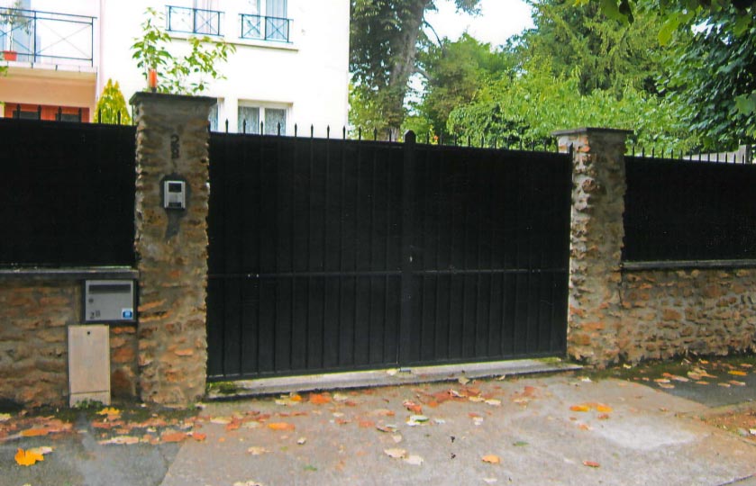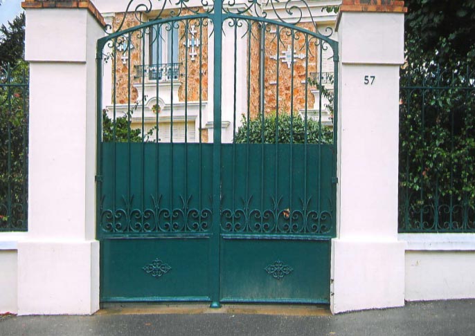 Portail en fer forgé, une clôture à ouverture et fermeture battante.