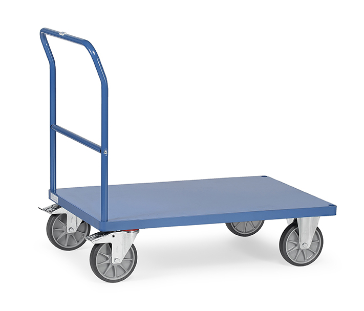 Équipé d’un plateau en tôle d'acier soudé dans l'armature avec 2 roues pivotantes et 2 roues fixes à bandage TPE, moyeu à roulement à billes central. Freins sur roues pivotantes conformément à la Norme 1757-3.