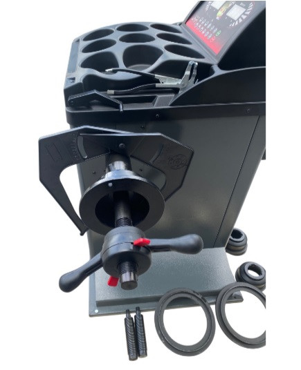 Elle est livrée avec tous ses accessoires, ce qui facilite son installation et lui permet de s’adapter à votre équipement pneumatique de garage existant : jauge de largeur, cônes (n°1 à n°4), écrou et cloche de serrage rapide, moyeu fileté, marteau d’équilibrage, poids de 100 g et clé hexagonale.