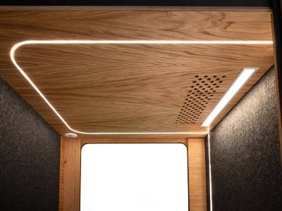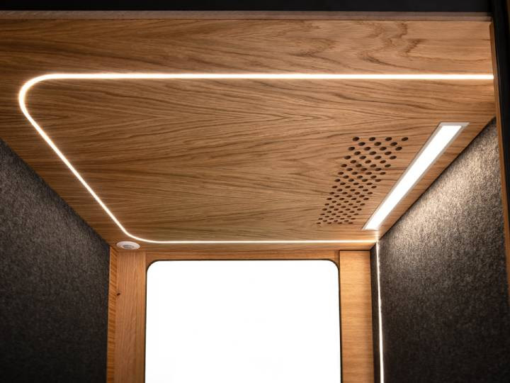 Grâce à une structure en MDF de 26 mm, des panneaux en feutre PET (composés à 60 % de plastique recyclé) et un vitrage acoustique triple couche, la cabine réduit efficacement les nuisances sonores. Vous profitez d’un environnement de travail silencieux, propice à la concentration, sans déranger vos collègues.