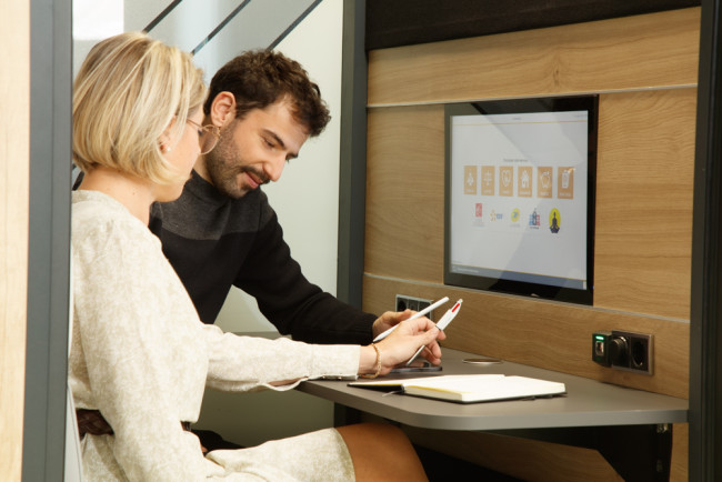 Cette cabine acoustique connectée 2 places permet de s’isoler, à deux, dans un espace confortable, équipé et connecté pour échanger, communiquer et travailler en toute tranquillité.
