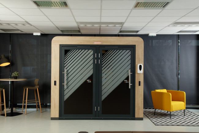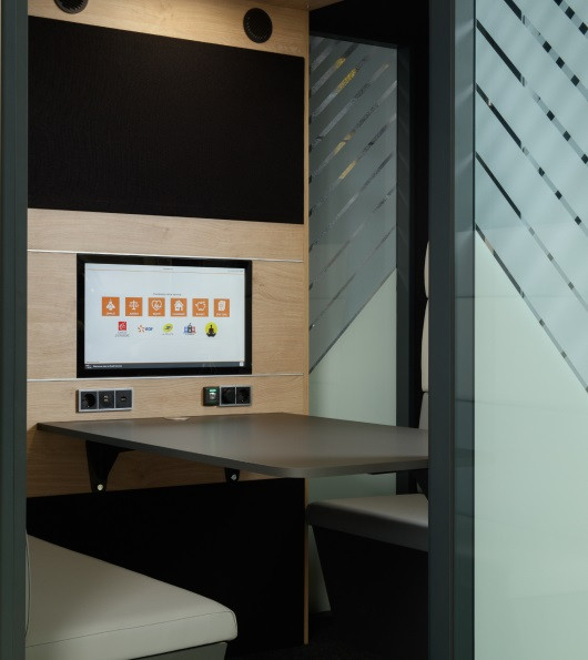 Cabine acoustique connectée 4 places permet de s’isoler, à quatre, dans un espace confortable, équipé et connecté pour échanger, communiquer et travailler en toute tranquillité.