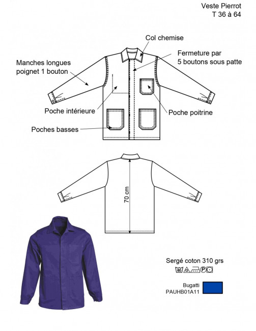 Elle est constituée d'un col chemise, d'une fermeture centrale par 5 boutons sous patte, de deux poignets réglables par bouton, d'une poche poitrine intérieure et de trois poches extérieures.