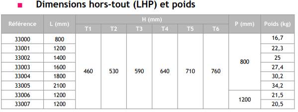 T1 : 460 mm / T2 : 530 mm / T3 : 590 mm / T4 : 640 mm / T5 : 710 mm / T6 : 760 mm
