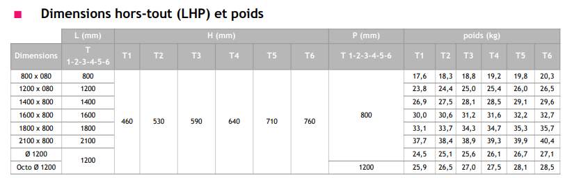 T1 : 460 mm / T2 : 530 mm / T3 : 590 mm / T4 : 640 mm / T5 : 710 mm / T6 : 760 mm