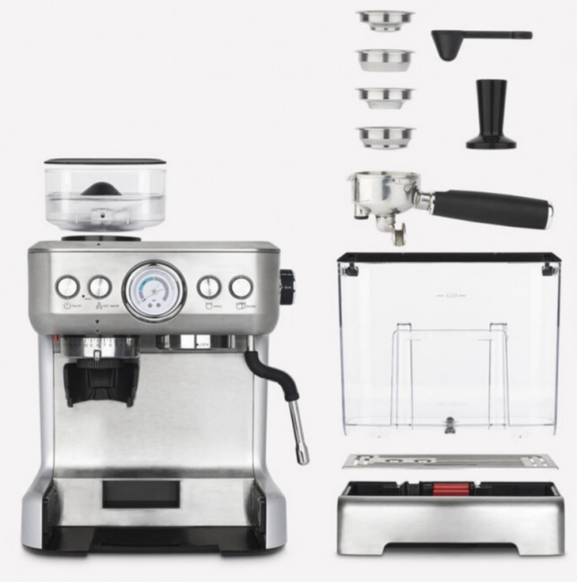 - Accessoires : 2 filtres en acier inoxydable simple et double, 2 filtres pressurisés en acier inoxydable simple et double, cuillère à mesure, tasseur à café