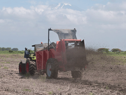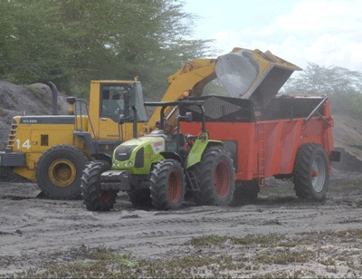 - L'entraînement du tapis s'effectue par le DE du tracteur (marche avant et arrière). Un régulateur de débit sur potence permet de varier la vitesse.