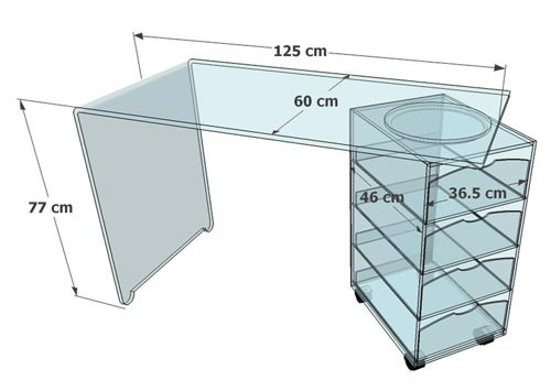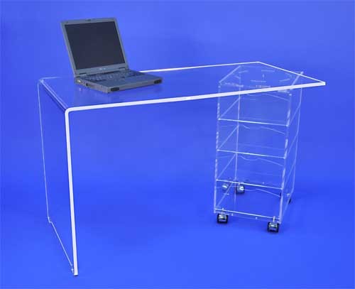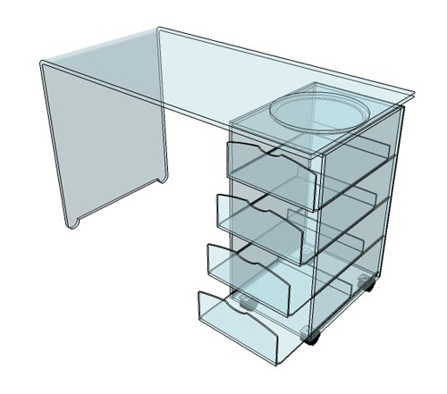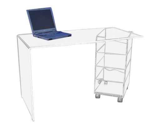 Ce bureau en plexiglas et comporte un caisson de 4 tiroirs qui pivote comme vous l'entendez.