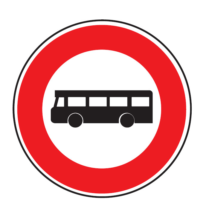 Ce panneau de type B9f, fabriqué en France, indique un accès interdit aux véhicules de transport en commun de personnes.