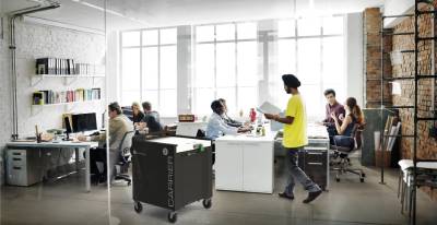 Le chariot permet de recharger jusqu’à 40 appareils à la fois, assurant une gestion rapide et efficace des équipements dans des environnements partagés.