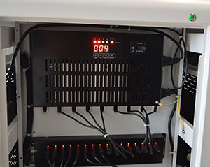 Le chariot est équipé d’un HUB USB intégré à l’arrière pour le chargement de toutes les tablettes, avec indicateurs LED individuels pour visualiser l’état de charge de chaque appareil. La présence d’un séquenceur d’alimentation permet de gérer la charge sans surcharge électrique, et une minuterie intégrée offre la possibilité de programmer la durée de chargement selon les besoins.
