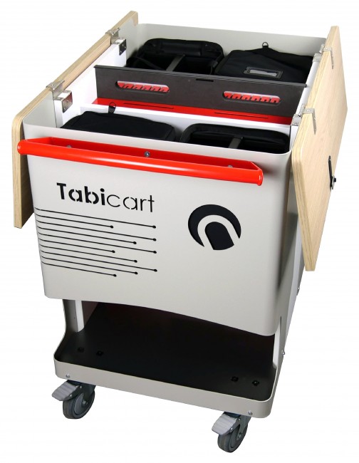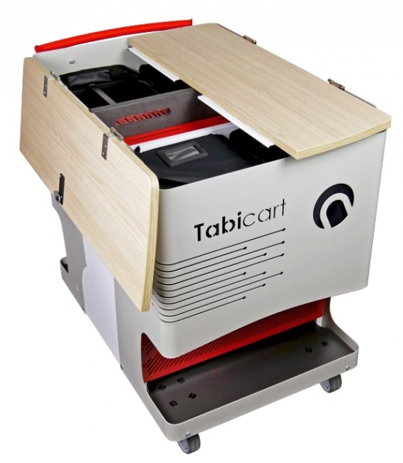 Ce chariot mobile compact avec sacoches de transport dispose d’une ouverture par trappes supérieures rabattables avec serrure à code, fournie avec une clé pass.
