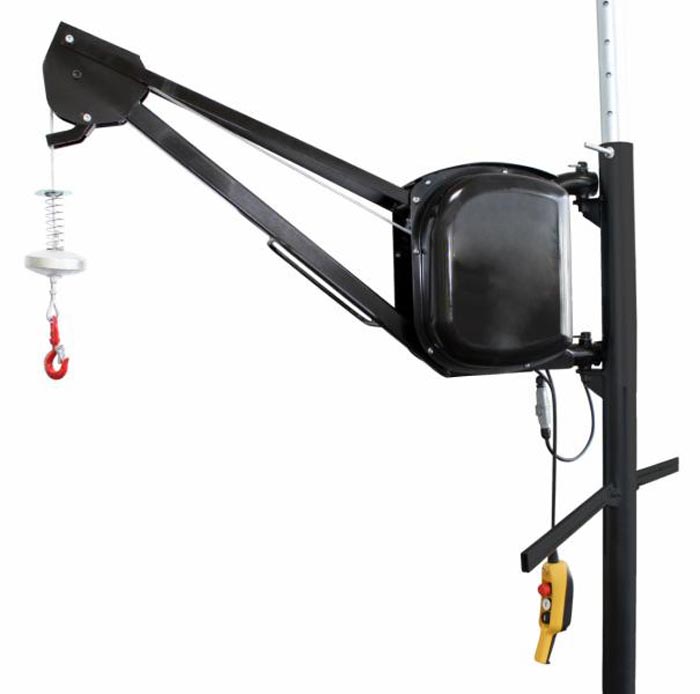 - Ensemble du treuil avec flèche pivotant à 200° par rapport au support de fixation au bâtiment.
