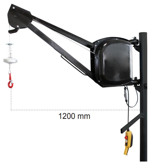 Ce treuil avec flèche est pivotant à 200° par rapport au support de fixation au bâtiment.