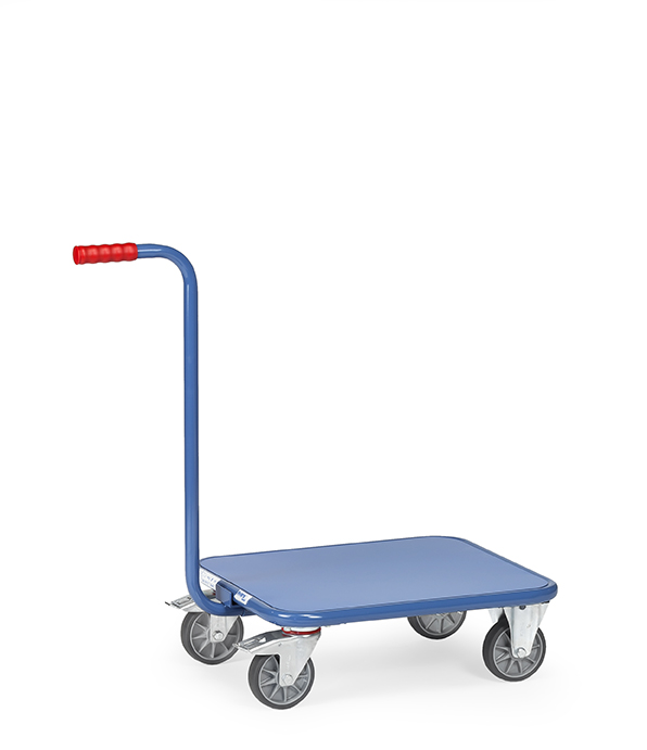 Équipé d’un plateau en tôle d’acier, d’une poignée à boulonner, de 2 roues pivotantes avec freins et2 roues fixes à bandage TPE 125 x 32 mm, moyeu à roulement à billes central.