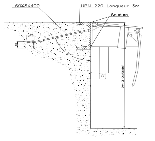 26/03/2026tel que mentionné sur le schèma mais avec gardes corps sur les deux côtés et peut supporter une charger de 3Tonnes (largeur de 4m si possible, longueur 2 à 3m). déplacement vers le bas jusqu"environ 15° par rapport à l"horizontale (système pouvant être arrêté à tout position voulu). SVP, envoyer détail de schèma du matériels et détailde fixation sur le béton.