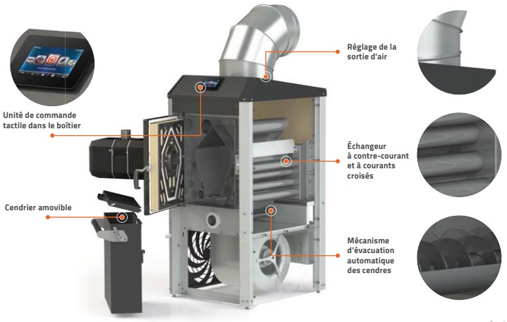 Le réchauffeur d'air est facile à utiliser et à entretenir, grâce à un accès simple à l'échangeur et à un mécanisme d'évacuation automatique des cendres.