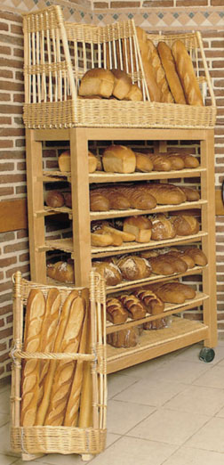 Présentoir pour pain en osier Dimensions : nombre de niveau : 2 niveaux profondeur : 60 cm hauteur : 1.20 Mètres longueur : 80 cm