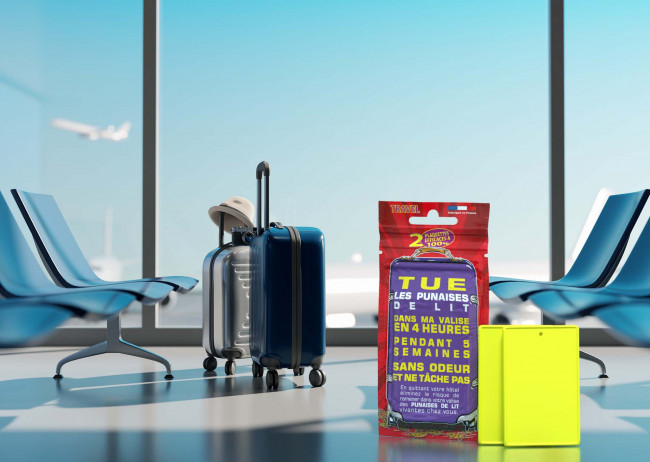 sortez la plaquette du sachet deposez la et fermez la valise. La diffusion démarre et tue les punaises de lit au terme de 4 heures.