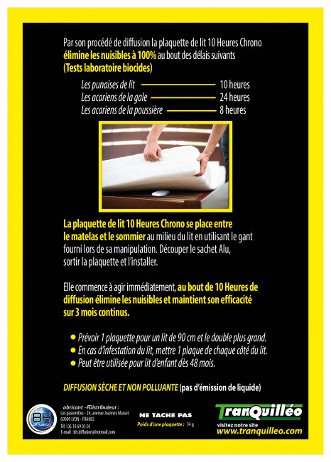Cette plaquette de lit est un traitement qui agit comme insecticide et comme répulsif sur les punaises de lit, les acariens, responsable de la gale.